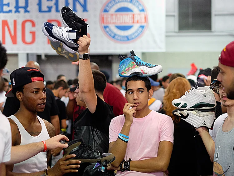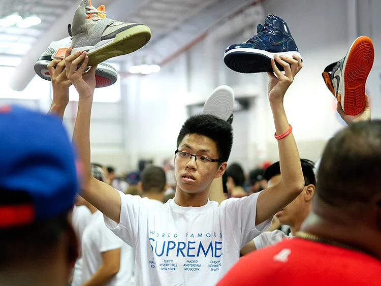 The first thing I did when I got inside the Javits Center was to take a lap around the whole building. This allowed me to figure out where the best photos might happen. Pushing and shoving through crowded aisles of sneaker fans carrying duffles full of shoes was no easy task, but I eventually reached the back of the hall. Here, past the regional and national vendors, in a chaotic mass, teen entrepreneurs were buying and selling pairs of shoes. It was clear that shooting here would be difficult but fruitful.